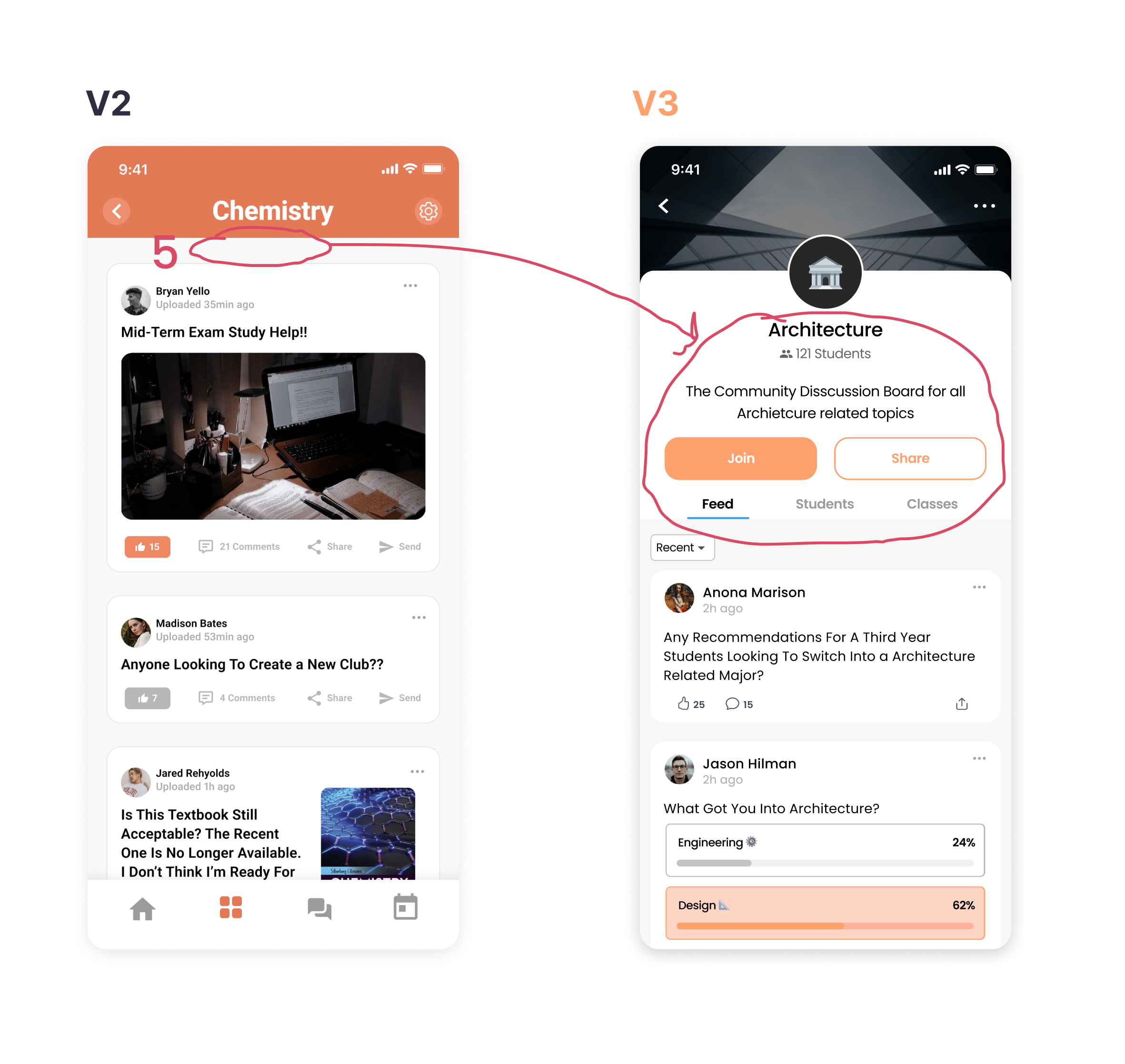 5) To provide more context for students, we added extra community board information such as the number of students, bios, and buttons to join and share.