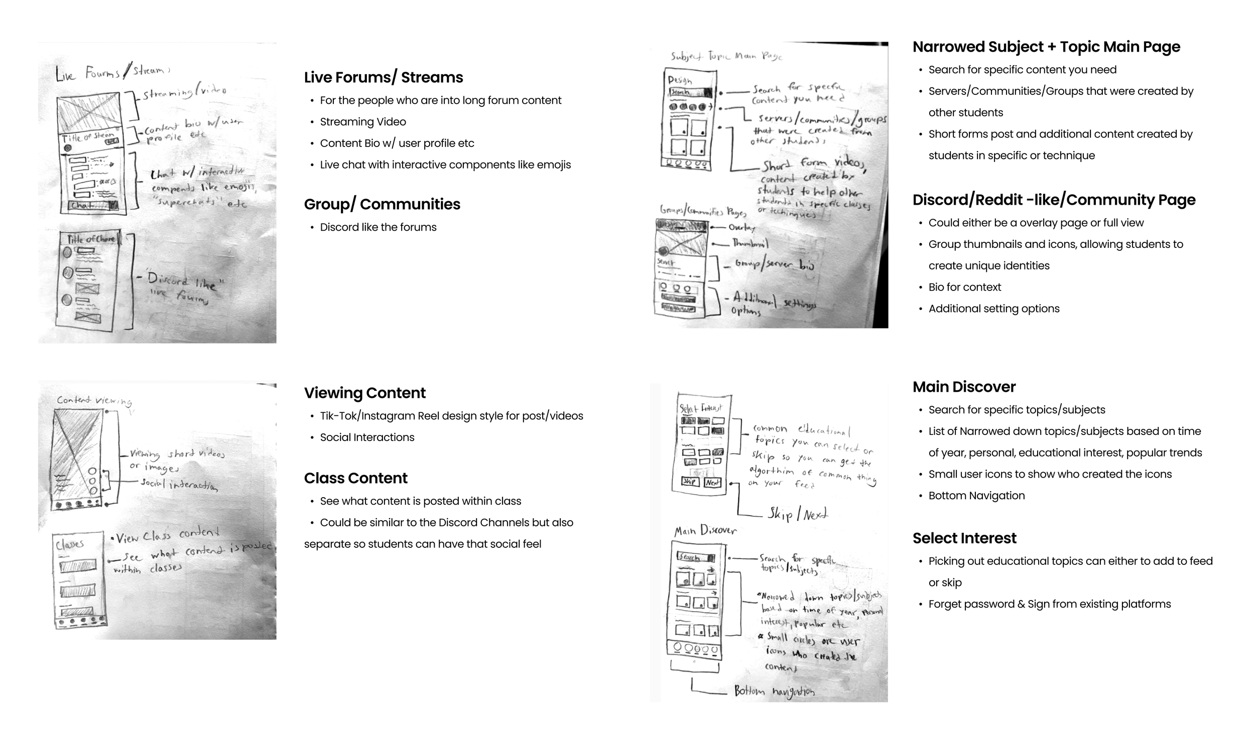 This sketch is based on my research into what other social media platforms are doing to grow, as well as interviews with students about what features they prefer on social media and remote tools. With these features, I thought about how students would interact with them.